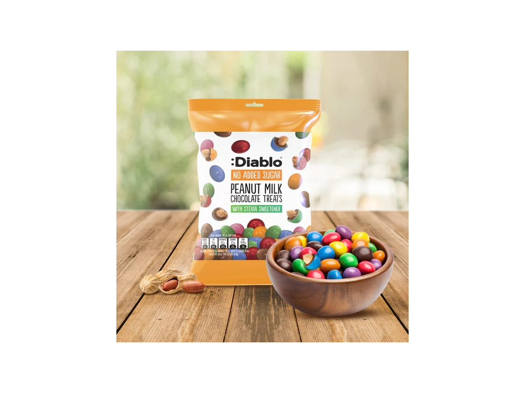 Farebné čokoládové dražé Diablo Peanut Milk Chocolate Treats sa vďaka hladkej ľadovej čokoládovej poleve neroztopia v ruke. Môžete po nich kedykoľvek siahnuť bez obáv, že vám na končekoch prstov zostanú stopy rozpustenej čokolády.