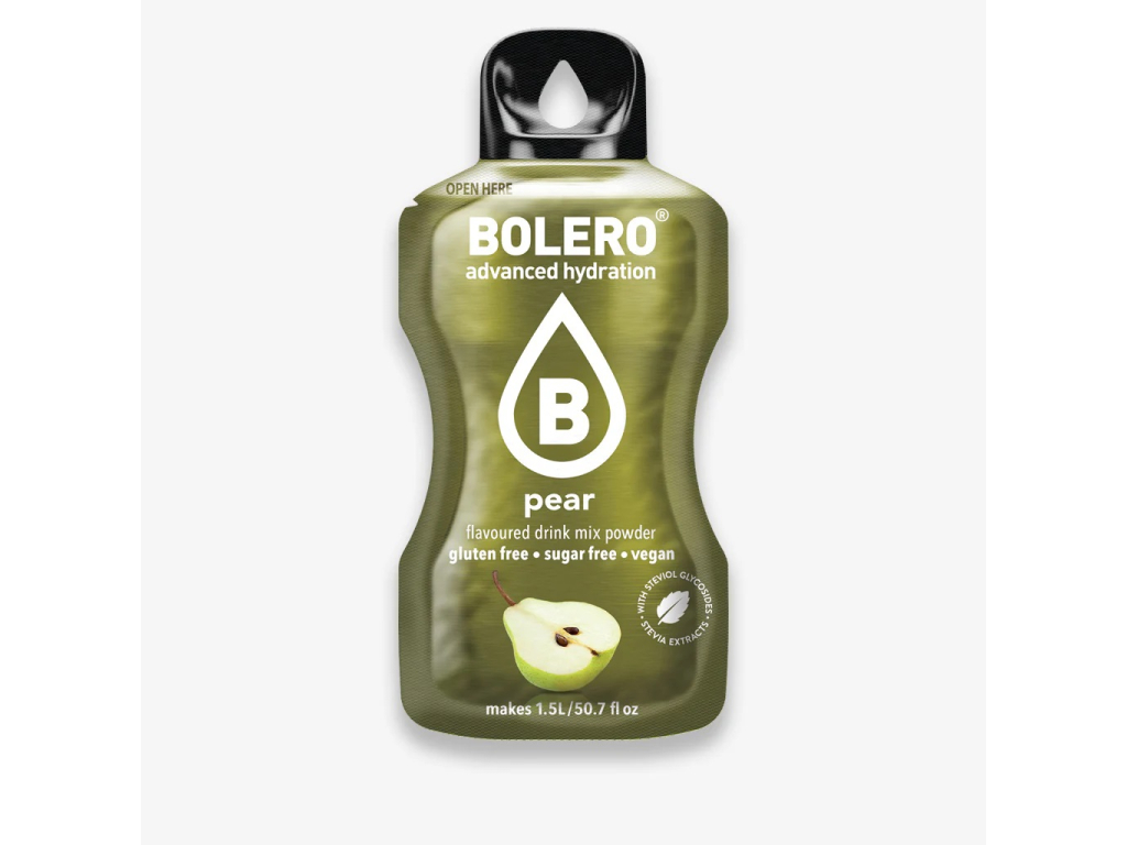 Bolero instantný nápoj s hruškovou príchuťou so stéviou, bez umelých farbív, aróm a konzervačných látok, obohatené o vitamín C. Vrecúško na zmiešanie s 1,5 l vody. Osladený stéviový osviežujúci nápoj s príchuťou hrušky je bez cukru a má len 2kcal.