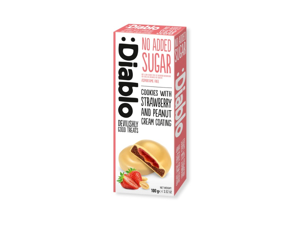 Vyskúšajte jemné sušienky s jahodovou plnkou a arašidovou polevou bez pridaného cukru od Diabla! Tieto pekelne dobré a lahodné sušienky od bristkého výrobcu Diablo sú bez pridaného cukru a teda so zníženým obsahom kalórií, sacharidov a cukrov, sladené prírodnými sladidlami.
